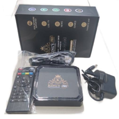 Kings Pro Plus. Android receiver. Android TV Box / Setup Box. King brand. Still for sale. Appeal from the King of the United Kingdom. 32 gb RAM + 512 gb store 10k Video support. Full one year warranty for live TV channels in each country for all sports live TV channels. 2.4 g and 5g network / Wi-Fi / Internet.